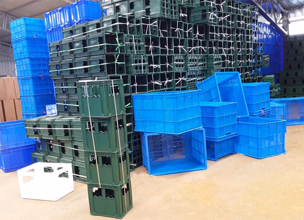 The first step: The hot water with detergent pre-washing the turnover baskets/crates/trays in the washing machine.